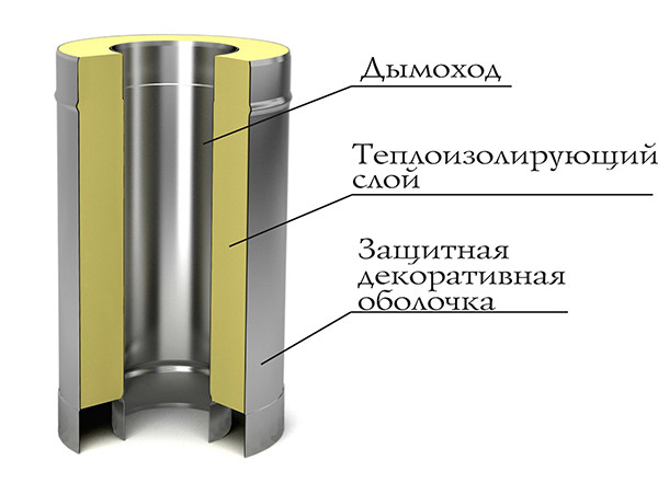 Today, the best type of chimney is the so-calledchimney sandwich. Structurally, such a chimney consists of two pipes - an inner pipe made of stainless steel and an outer pipe made of galvanized or stainless steel. Between the inner and outer pipe is a heat-insulating layer of basalt fiber or other heat-insulating material. Due to the presence of a thermal insulation layer, such chimneys warm up quickly and retain the necessary draft and, of course, minimize the formation of condensation inside.