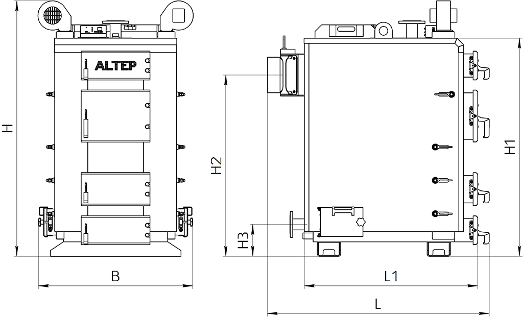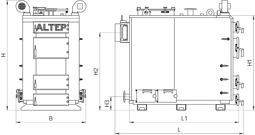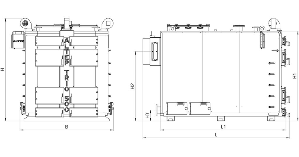 Overall dimensions of the Altep TRIO 500 kW boiler